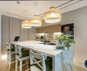 The apartment is fully renovated to a high specification, with modern flooring, a contemporary kitchen, and upgraded bathrooms. The bright open-plan living and dining area flows seamlessly onto the terrace, maximising space and natural light. Both bedrooms are generously sized, and the maid’s room adds valuable flexibility.